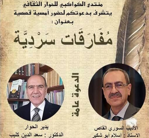 في رحاب منتدى الكواكبي للحوار الثقافي، وعلى مدرج النصر بمدينة حلب، أقيمت أمسية أدبية مميزة استضافت الأديب والقاص الأستاذ إسلام أبو شكير، تحت عنوان “مفارقات سرديّة”.